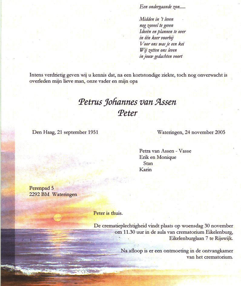 Na het overlijden van Peter is onderstaand overlijdensbericht verstuurd: